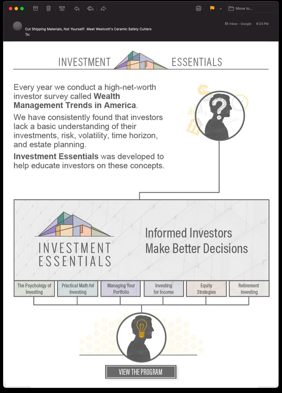 The Investment Essentials Campaign is based around six principals that are key to successful investing. For this campaign I created a visual identity that leaned heavily into the modularity of this concept. I created a mark based on architectural support to represent the all the “essentials” of investing and designated a specific section of the mark to each category in the campaign. Each essential had a color chosen from our corporate brand guide which was used on print pieces and the campaign site for an easy visual indicator of the content.